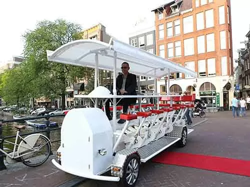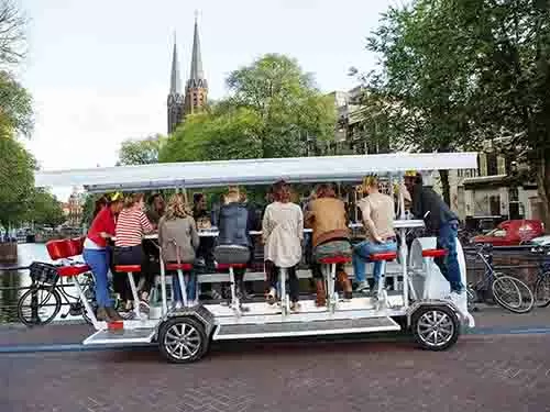 The Prosecco bike in Amsterdam is the ultimate way to experience this city of cyclists, seeing the sights and having a drink at the same time. Our prosecco bikes come complete with a driver to navigate all the corners while we provide enough prosecco for everyone to enjoy. All you need to worry about is putting some power into the pedals and enjoying your time weaving past the canals!